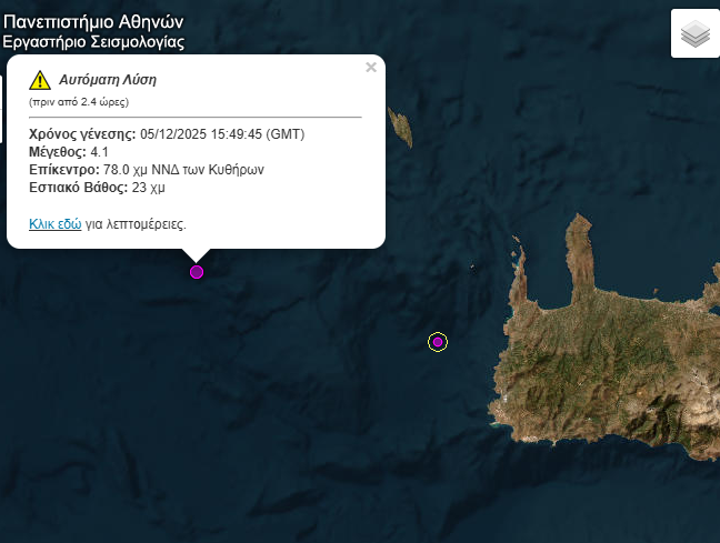 Το Εργαστήριο Σεισμολογίας του Πανεπιστημίου Αθηνών, κατέγραψε την σεισμική δόνηση 4,1 Ρίχτερ, 78 χλμ ΝΝΔ των Κυθήρων σε βάθος 23 χλμ.
