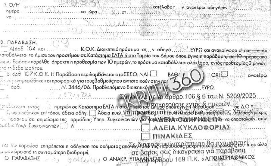 Έτσι, το πρωί της Τετάρτης, ένα ζευγάρι στα Χανιά βρέθηκε ξαφνικά αντιμέτωπο με κατάσχεση διπλώματος οδήγησης και υψηλά πρόστιμα, με την παράβαση να είναι τόσο γραφειοκρατικής φύσεως που η τιμωρία είναι εξοντωτική.