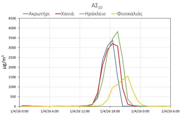 Οι μέγιστες συγκεντρώσεις σκόνης που παρατηρηθήκαν (ωριαίες τιμές) ήταν 3211 μg/m3 στα Χανιά, 3402 μg/m3 στο Ακρωτήρι, 3826 μg/m3 στο Ηράκλειο και 1555 μg/m3 στο Φινοκαλιά. Η οριακή τιμή για την ανθρώπινη υγεία βάσει της ισχύουσας νομοθεσίας είναι τα 50 μg/m3 (μέση ημερήσια τιμή), και παρατηρήθηκε υπέρβαση σε όλη την Κρήτη με υπερδεκαπλάσιες συγκεντρώσεις των ορίων. Το επεισόδιο σκόνης συνεχίζεται και σήμερα 02 Απριλίου με χαμηλότερες μέχρι στιγμής συγκεντρώσεις.