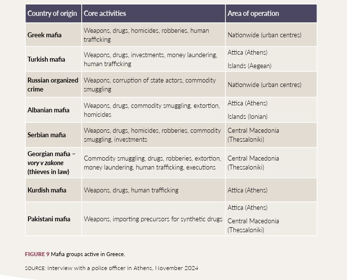Τουλάχιστον δέκα ξένες μαφίες δρουν στη χώρα, γεγονός που οδήγησε έναν αναλυτή να χαρακτηρίσει την Ελλάδα ως «την Κολομβία των Βαλκανίων», όπως αναφέρεται στην έρευνα του Global Initiative. Η ελληνική μαφία είναι επίσης σημαντικός παράγοντας· δρα περιφερειακά οργανωμένη και δραστηριοποιείται στα μεγάλα αστικά κέντρα.