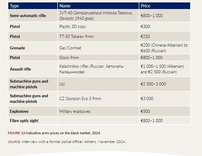 Οι ρωσικής προέλευσης χειροβομβίδες κοστίζουν περίπου 400–600 ευρώ, ενώ τα λαθραία Uzi και Skorpion που πουλάνε Ρώσοι έμποροι ξεκινούν από 3.000 ευρώ και ανεβαίνουν ανάλογα με την ποιότητα και την απόδοση. Τέλος, πιστόλια Glock 9mm πωλούνται από 800 έως 1.000 ευρώ— τιμές συγκρίσιμες με την νόμιμη αγορά.