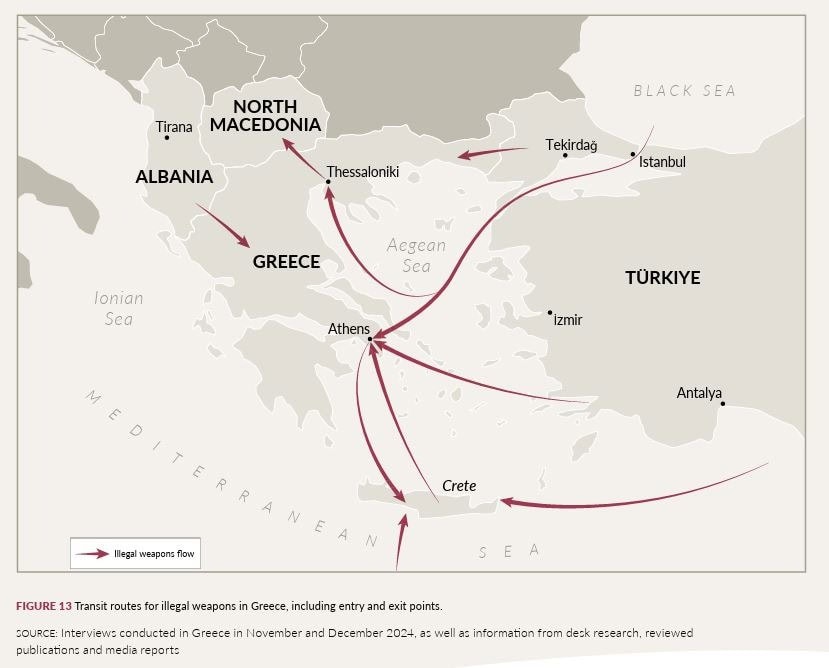 Τα παράνομα όπλα εισάγονται στην Ελλάδα μέσω χερσαίων και θαλάσσιων διαδρομών που αποτελούν μέρος των ευρύτερων βαλκανικών δικτύων.