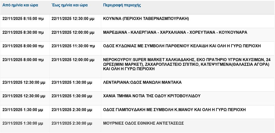 Προγραμματισμένες διακοπές ρεύματος στα Χανιά θα πραγματοποιήσει ο ΔΕΔΗΕ εξαιτίας έργων συντήρησης και επέκτασης του δικτύου του, το Σάββατο 22 και την Κυριακή 23 Νοεμβρίου.
