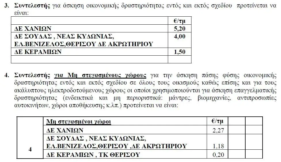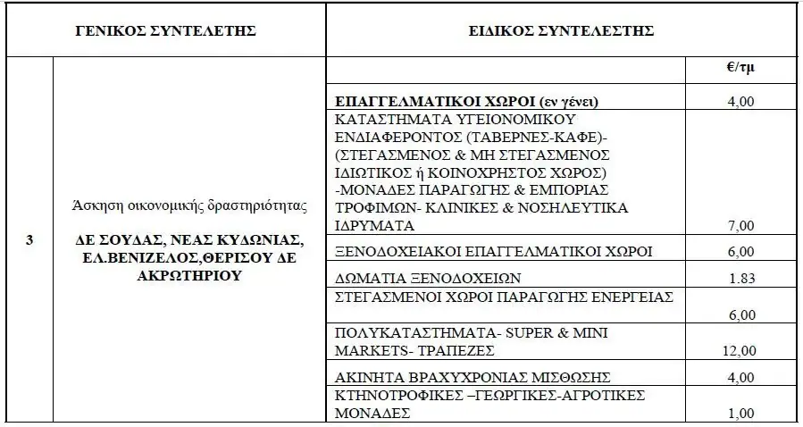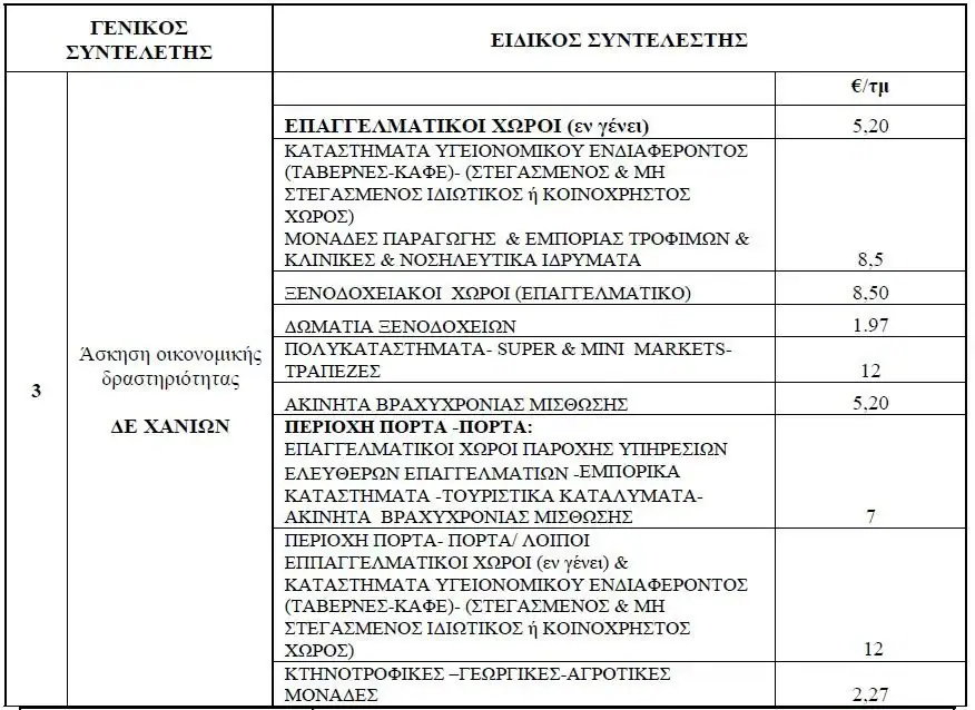 Ειδικά για τα ξενοδοχεία και τουριστικά καταλύματα ως μη στεγασμένος χώρος χρησιμοποιούμενος για άσκηση επαγγελματικής δραστηριότητας ορίζεται το εμβαδόν της επιφάνειας της πισίνας και το τέλος ορίζεται ίσο με τον ισχύοντα συντελεστή για τους Λοιπούς Ξενοδοχειακούς Χώρους σε κάθε Δημοτική Ενότητα.
