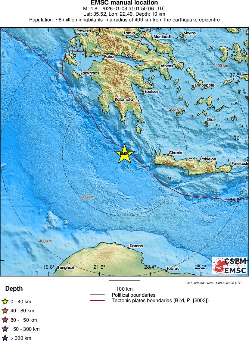 Σεισμός μεγέθους 4,8 βαθμών της κλίμακας Ρίχτερ (σύμφωνα με το Ευρωμεσογειακό Σεισμολογικό Ινστιτούτο), σημειώθηκε σήμερα στις 03:50 στον θαλάσσιο χώρο δυτικά της Κρήτης.