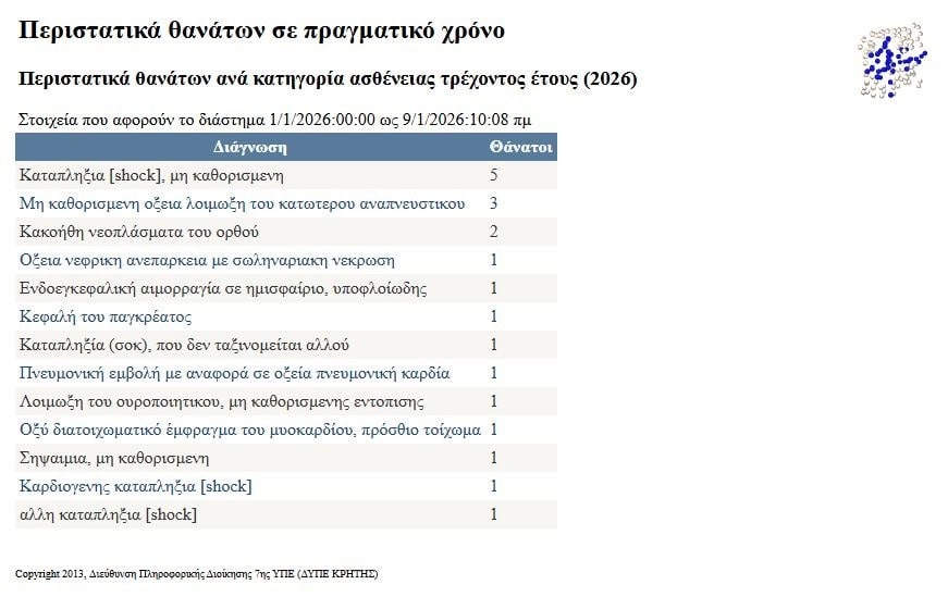 Σύμφωνα με τα επίσημα στοιχεία της 7ης ΥΠΕ Κρήτης, από 1 Ιανουαρίου μέχρι και 9 Ιανουαρίου έφυγαν από τη ζωή 20 άνθρωποι από διάφορες αιτίες.