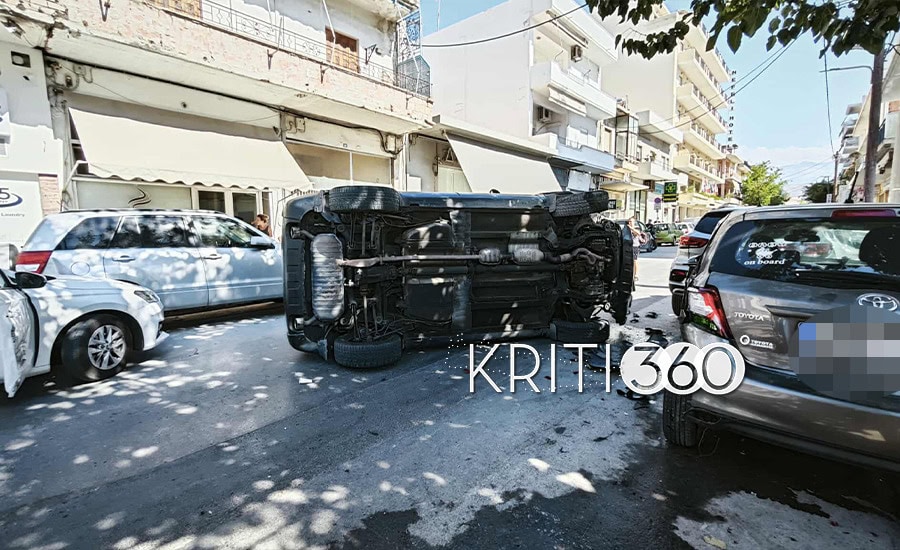 Ένα τζιπ και ένα αυτοκίνητο συγκρούστηκαν, με αποτέλεσμα το τζιπ να πέσει σε σταθμευμένα αυτοκίνητα και να τουμπάρει, πέφτοντας στο πλάι.
