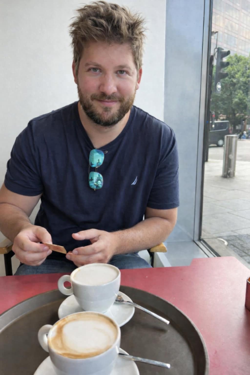 Όπως σημειώνεται στη δημοσίευση, ο Αλέξης φοράει γαλάζιο φούτερ με κουκούλα.