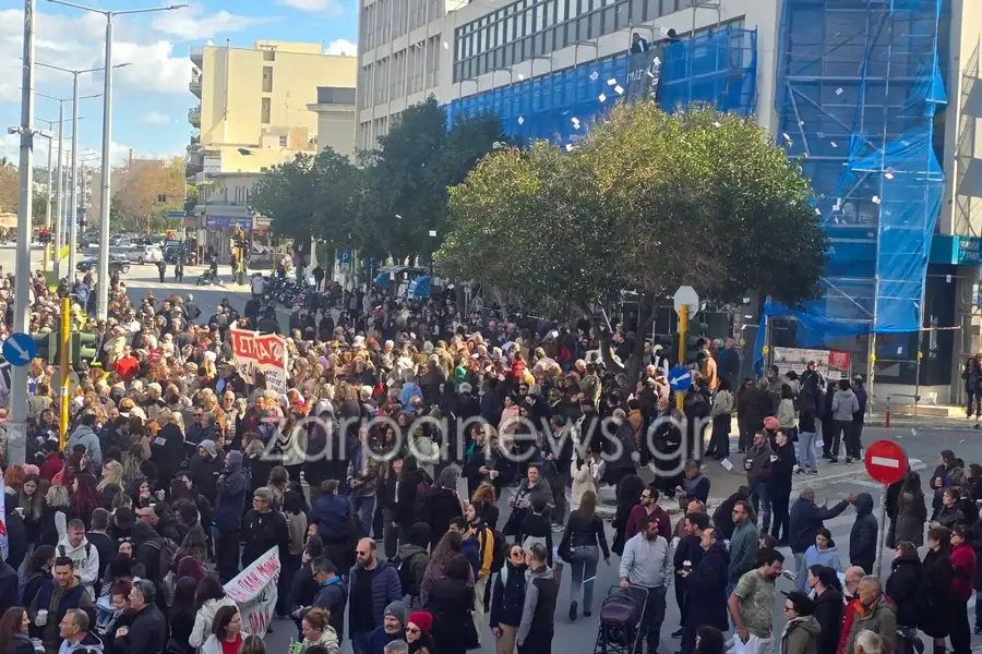 Μεγάλη μαζικότητα χαρακτηρίζει το συλλαλητήριο για τα Τέμπη στα Χανιά, με μπροστάρηδες τους νέους, μαθητές και φοιτητές.
