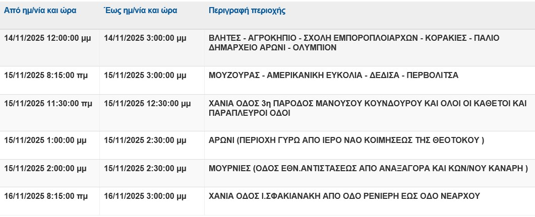 Προγραμματισμένες διακοπές ρεύματος στα Χανιά θα πραγματοποιήσει ο ΔΕΔΗΕ εξαιτίας έργων συντήρησης και επέκτασης του δικτύου του, το Σάββατο 15 και την Κυριακή 16 Νοεμβρίου.