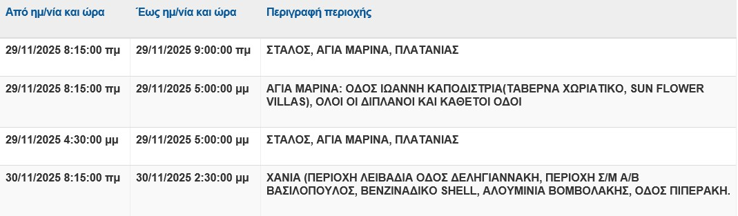 Προγραμματισμένες διακοπές ρεύματος στα Χανιά θα πραγματοποιήσει ο ΔΕΔΗΕ εξαιτίας έργων συντήρησης και επέκτασης του δικτύου του, το Σάββατο 29 και την Κυριακή 30 Νοεμβρίου.