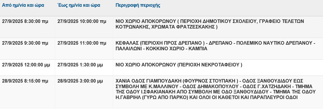 Προγραμματισμένες διακοπές ρεύματος στα Χανιά θα πραγματοποιήσει ο ΔΕΔΗΕ εξαιτίας έργων συντήρησης και επέκτασης του δικτύου του, το Σάββατο 27 και την Κυριακή 28 Σεπτεμβρίου.