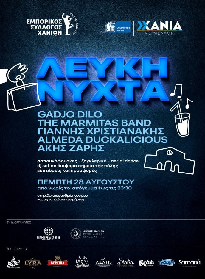 Ο Εμπορικός Σύλλογος Χανίων και το Επιμελητήριο Χανίων σας καλεί να συμμετέχετε στην 4η «Λευκή Νύχτα» που διοργανώνετε την Πέμπτη 28 Αυγούστου 2025 από νωρίς το απόγευμα έως τις 23.30 το βράδυ.