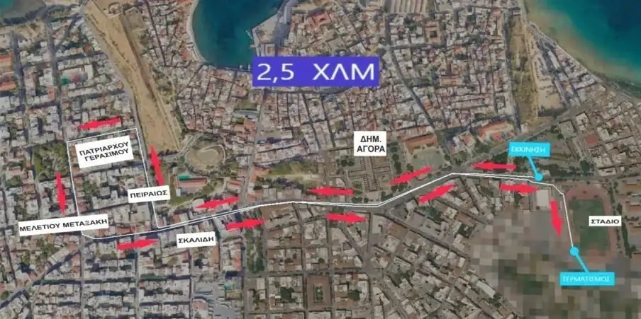 Περιγραφή της Διαδρομής: Εκκίνηση από Ελευθ. Βενιζέλου (έξω από την κεντρική είσοδο του σταδίου Χανίων) – Χατζημιχάλη Γιάνναρη (Αγορά) – Σκαλίδη – Πειραιώς –Πατριάρχου Γερασίμου – Μελετίου Μεταξάκη – Σκαλίδη – Χατζημιχάλη Γιάνναρη (Αγορά) –Ελευθ. Βενιζέλου – Εθνικό Στάδιο Χανίων (Έλενας Βενιζέλου) –Τερματισμός (100 μ.).
