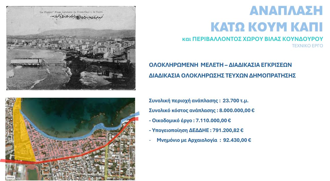 Αξίζει να σημειωθεί ότι η ανάπλαση του παραλιακού μετώπου του Κουμ Καπι, αποτελεί ξεχωριστό έργο, το οποίο θα “κουμπώσει” με το παραλιακό μέτωπο του ενετικού λιμανιού. Και εκεί υπάρχουν μεγάλες καθυστερήσεις στη διαδικασία των εγκρίσεων, καθώς εμπλέκονται 7 συναρμόδια υπουργεία!