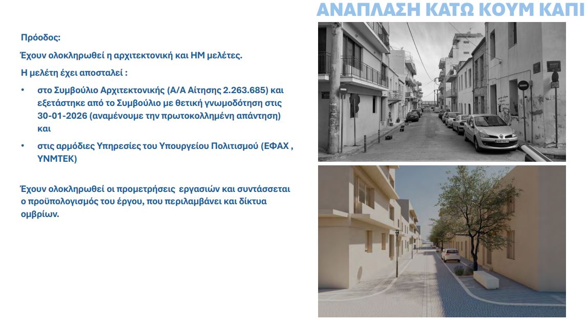 Σε τροχιά υλοποίησης μπαίνει, έστω και με αρκετές καθυστερήσεις, το μεγάλο έργο της ανάπλασης της γειτονιάς του Κουμ Καπί (κάτω από την οδό Ελ. Βενιζέλου). Πρόκειται για παρεμβάσες αστικής ανάπλασης σε μια συνολική περιοχή παρέμβασης 23.700 τμ με συνολικό κόστος 8 εκ ευρώ που θα χρηματοδοτηθεί από το σχέδιο βιώσιμης αστικής ανάπτυξης του Δήμου Χανίων.