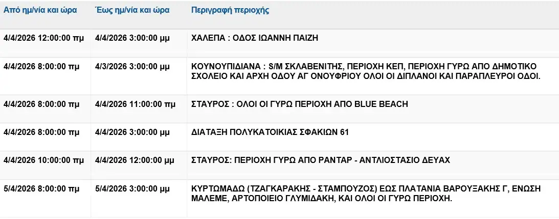 Προγραμματισμένες διακοπές ρεύματος στο Νομό Χανίων θα πραγματοποιήσει ο ΔΕΔΗΕ το Σάββατο 4 και την Κυριακή 5 Απριλίου εξαιτίας έργων συντήρησης και επέκτασης του δικτύου του.