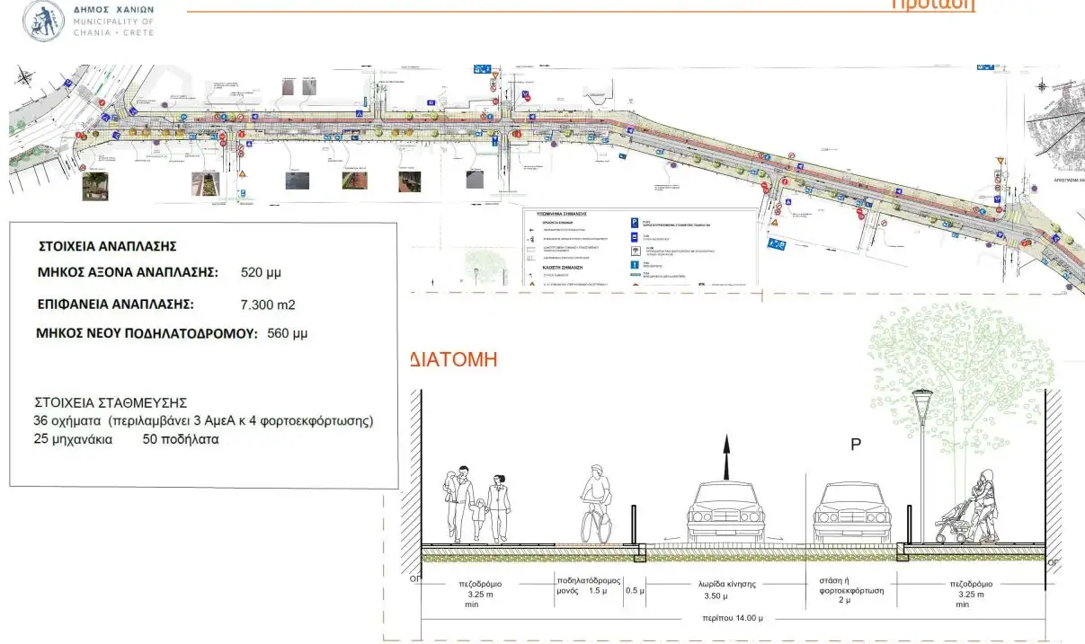 Μετά την ολοκλήρωση της ανάπλασης, η στάθμευση θα περιοριστεί στο ελάχιστο καθώς προβλέπονται θέσεις στάθμευσης για 36 οχήματα, 25 μηχανάκια και 50 ποδήλατα!