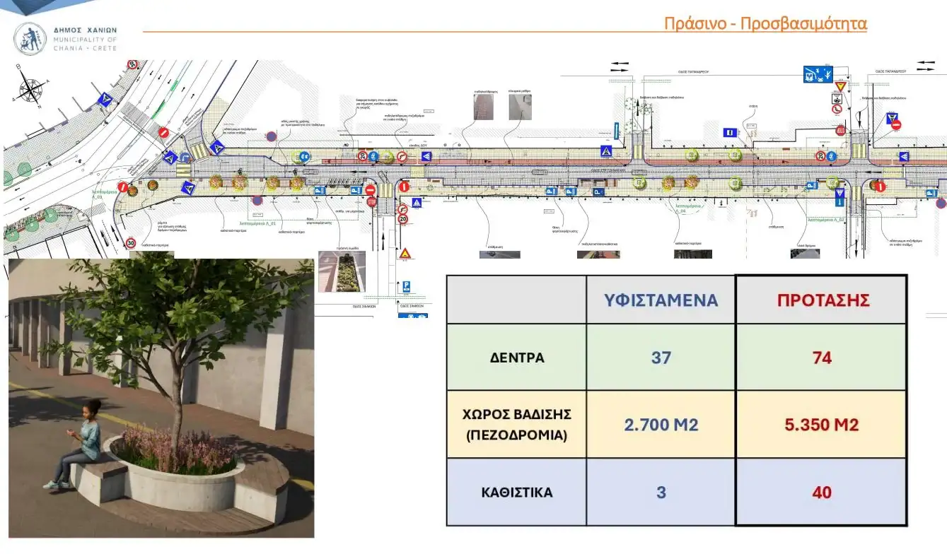 - Φροντίδα για κατοίκους και επιχειρηματίες:-στάθμευση μονίμων κατοίκων , ΑμεΑ, φορτοεκφόρτωσης, δίκυκλων– Βελτίωση βατότητας, στάσεις πεζών, καθιστικά, σκίαση, νέο πράσινο, βελτίωση μικροκλίματος