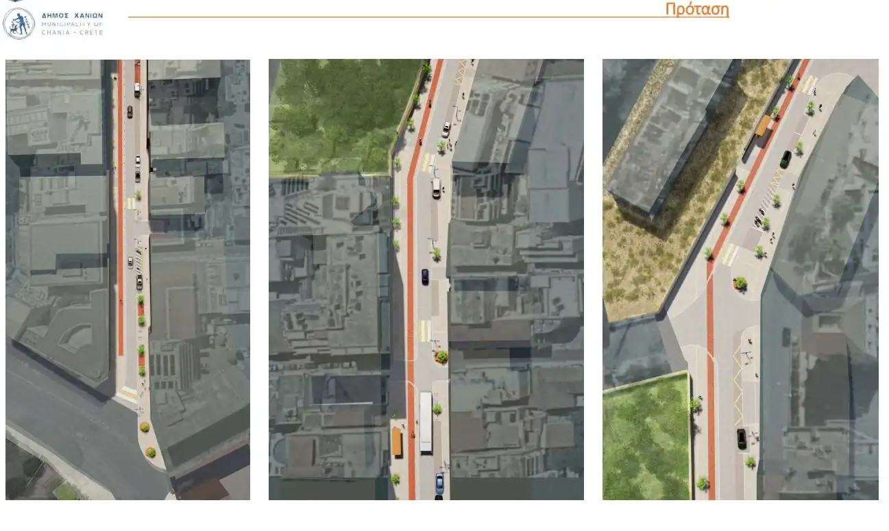 - Oργάνωση κυκλοφορίας οχημάτων:– σε μία λωρίδας ήπιας κυκλοφορίας , με στόχο τη μελλοντική ολική πεζοδρόμηση– νέος ποδηλατόδρομος που πληρεί τις τεχνικές προδιαγραφές , είναι ασφαλής και θελκτικός– διαμόρφωση και σήμανση στάσεων λεωφορείων