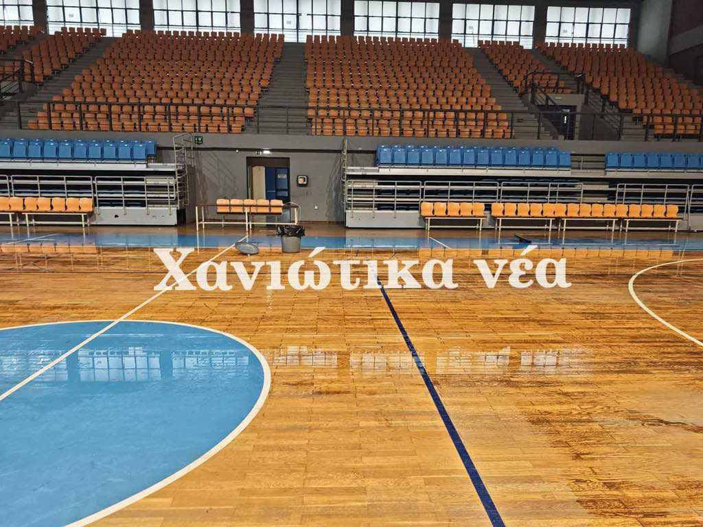 Λόγω και των πρόσφατων βροχοπτώσεων γήπεδο “έβαλε” νερό γεμίζοντας το παρκέ, όπως φαίνεται και στις φωτογραφίες που δημοσιεύει το haniotika-nea.gr.