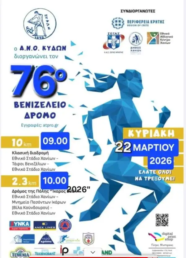 Κλειστοί θα είναι από τις 9 το πρωί της Κυριακής κεντρικοί δρόμοι της πόλης των Χανίων από το Εθνικό στάδιο μέχρι τους Τάφους Βενιζέλων, για την διεξαγωγή του 76ου Βενιζέλειου Αγώνα Δρόμου και του Δρόμου της Πόλης «ΙΚΑΡΟΣ 2026».