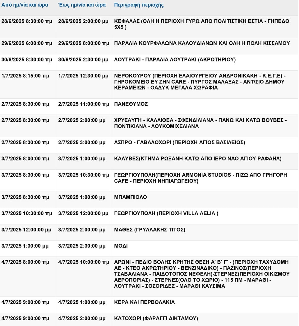 Χανιά: Σημαντικές διακοπές ρεύματος τις επόμενες ημέρες