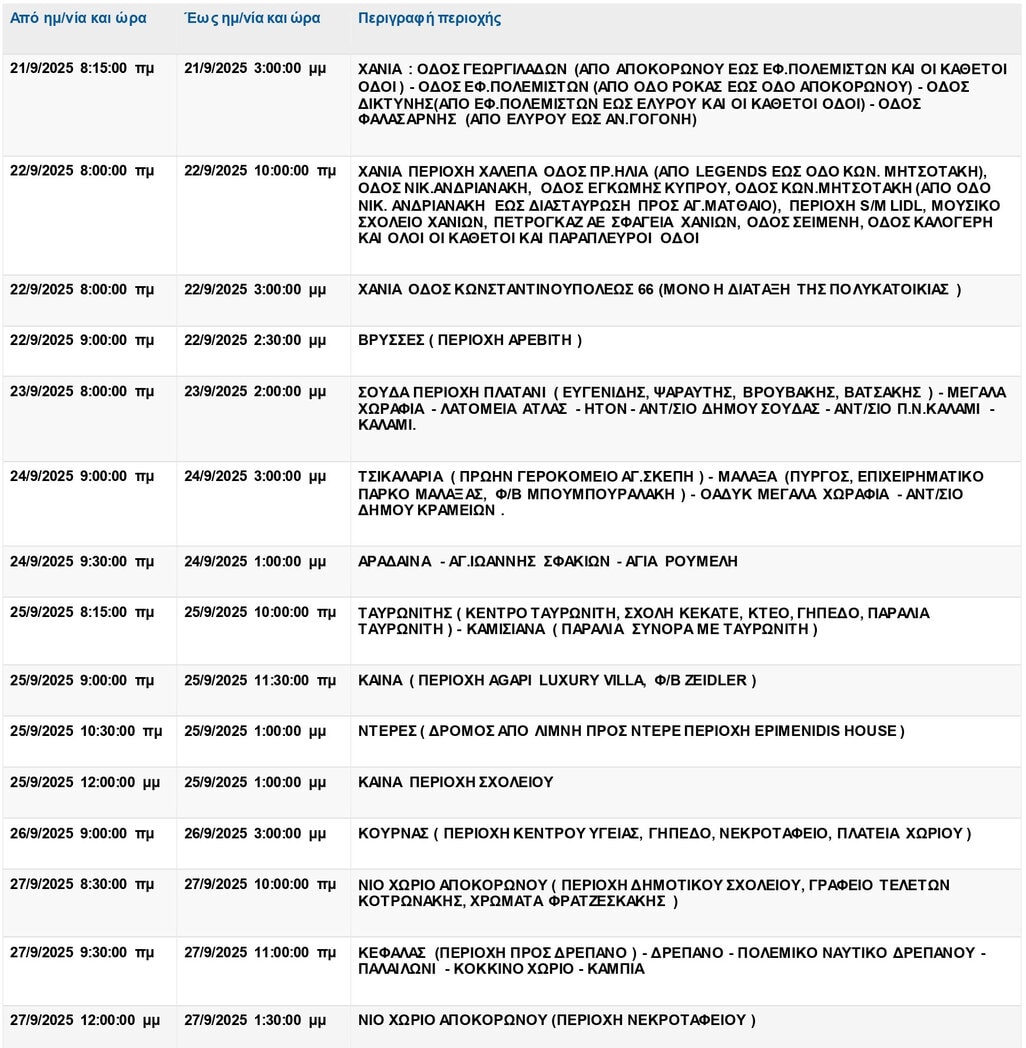 Χανιά: Σημαντικές διακοπές ρεύματος την ερχόμενη εβδομάδα