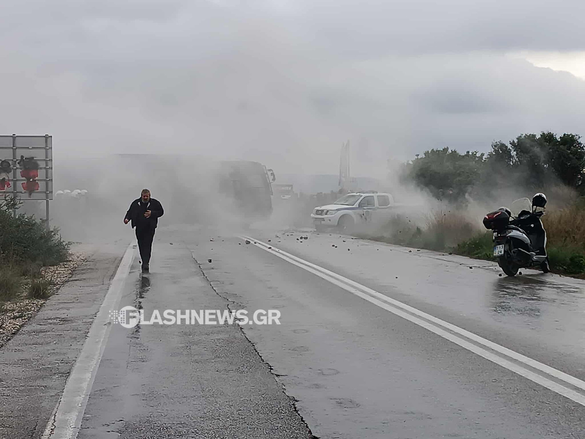 Κατά τη διάρκεια των επεισοδίων, οι αγρότες αναποδογύρισαν περιπολικό της αστυνομίας, το οποίο υπέστη σοβαρές υλικές ζημιές. Παράλληλα, ζημιές υπέστη και η κλούβα της αστυνομίας από τον πετροπόλεμο, η οποία στη συνέχεια απομακρύνθηκε. Οι πέτρες στο οδόστρωμα είναι αμέτρητες, όπως φαίνεται χαρακτηριστικά και από τις παρακάτω φωτογραφίες.