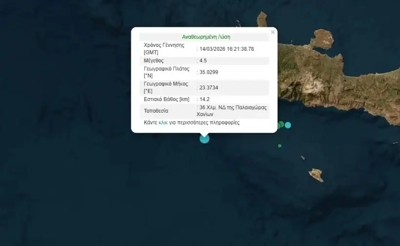 Χανιά | Σεισμός 4,5 Ρίχτερ νοτιοδυτικά της Παλαιοχώρας